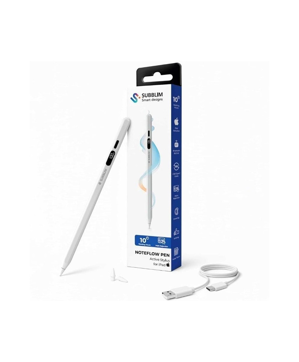 SUBBLIM NoteFlow Pen for iPad – Stylus con pantalla de batería, Palm Rejection, sensibilidad a la inclinación y punta POM 0,9 mm – Compatible iPad 2018–2025 (Pro, Air, mini, iPad)NoteFlow Pen para iPad SUBBLIM. Escribe y dibuja como en papel en tu iPad. NoteFlow Pen for iPad combina Palm Rejection para apoyar la mano sin toques fantasma y sensibilidad a la inclinación para sombrear o variar el grosor con un gesto natural. La punta POM de 0,9 mm ofrece control fino y deslizamiento suave; incluye 2 repuestos para mantener siempre un trazo consistente.
