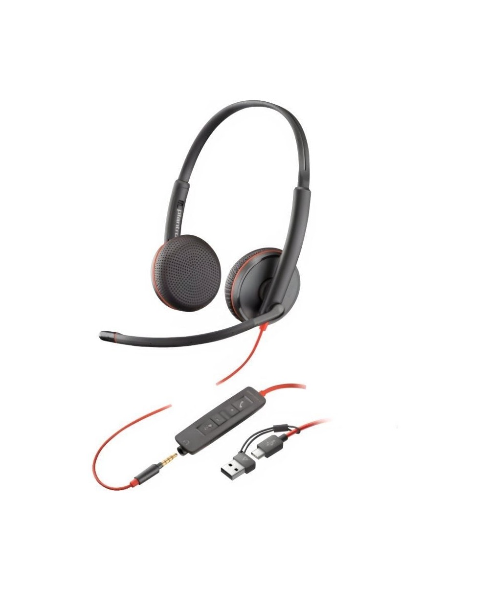 Auriculares estéreo Poly Blackwire 3225 + conector de 3,5 mm + adaptador USB-C/A (a granel)