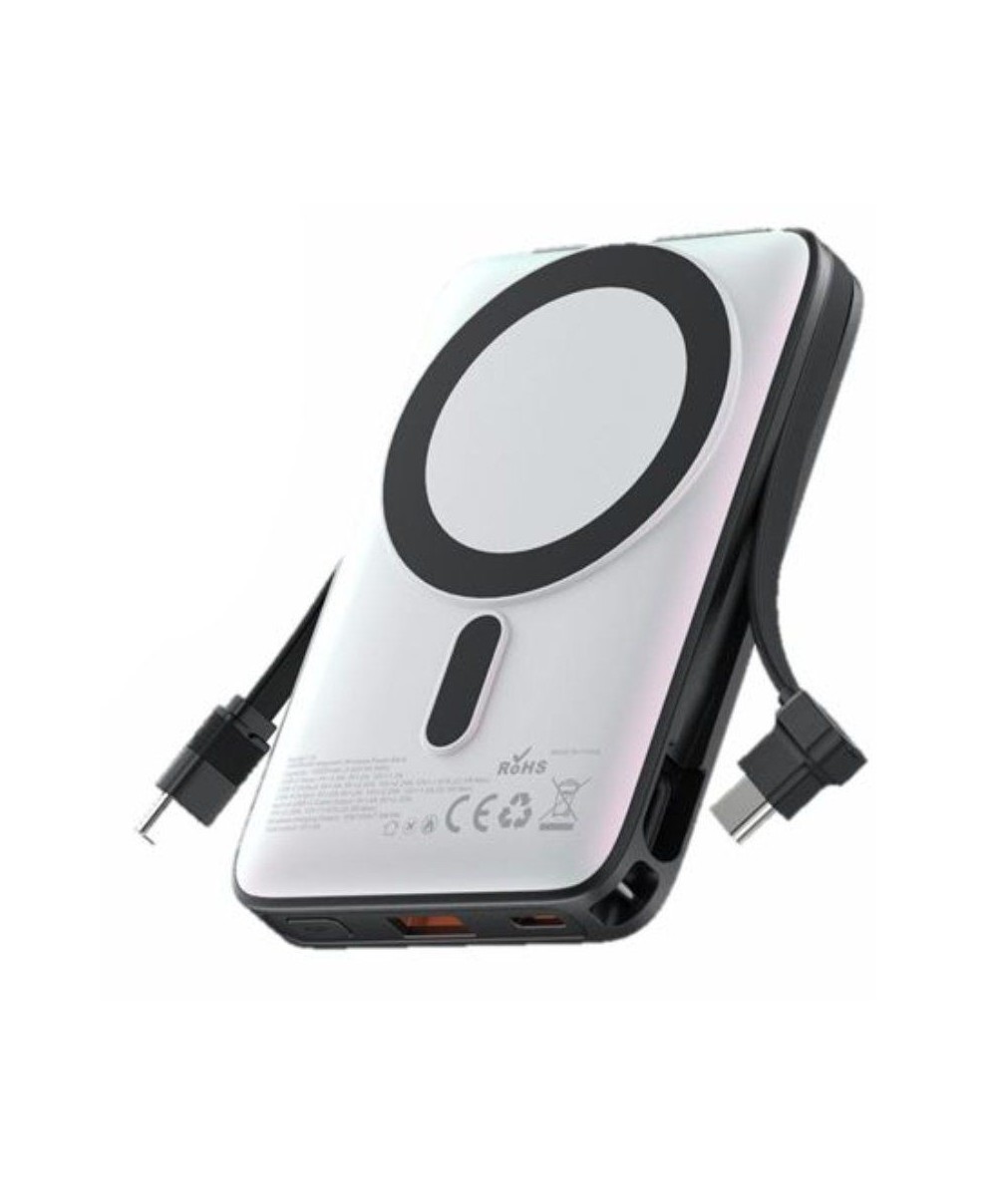 Batería externa magnética de 10,000 mAh (USB-C + USB-C/USB-A/Inalámbrico) con cable incorporado y soporte. Potencia de salida: 22.5 W Pantalla LED blanca Material: ABS con recubrimiento UV Soporte de aleación de aluminio