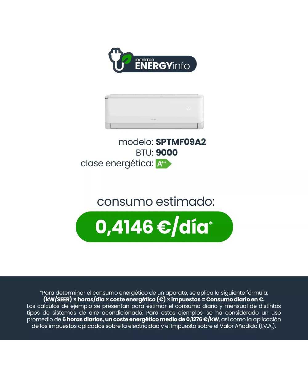 El modelo INFINITON SPTMF09A2 es una solución compacta, eficiente y versátil para climatizar estancias de tamaño medio, como salones, dormitorios u oficinas de hasta 20 m². Gracias a su tecnología Inverter, este split ajusta la potencia de funcionamiento de forma continua, lo que se traduce en un menor consumo energético, mayor durabilidad del compresor y un ambiente más estable.