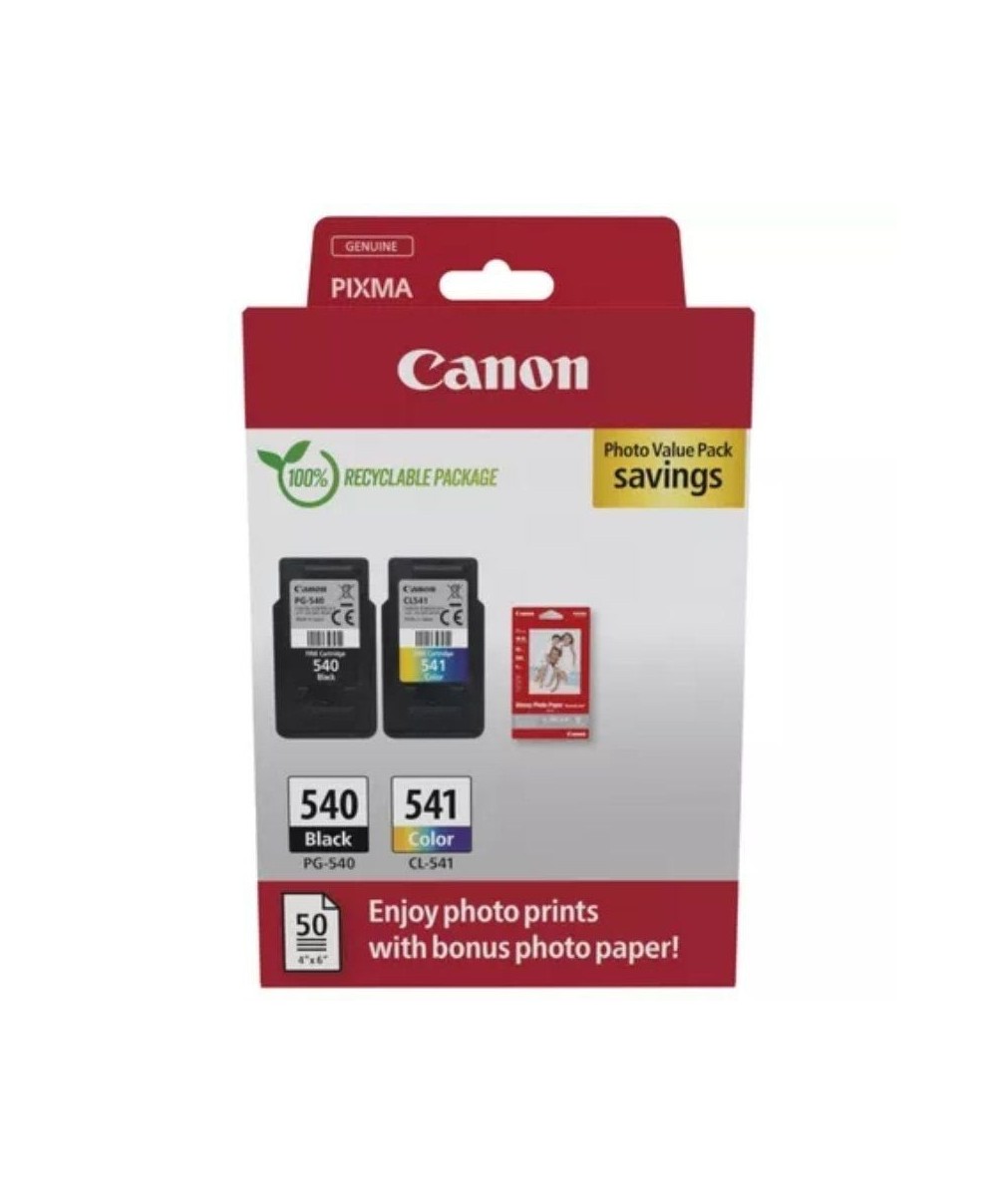 Este pack de oferta es la solución ideal para una impresión asequible. Incluye el cartucho de tinta de color CL-541 de 8 ml para imprimir hasta 180 páginas llenas de colores y un cartucho de tinta PG-540 de 8 ml para imprimir hasta 180 páginas de negros intensos. La tinta Canon original garantiza una mayor calidad y fiabilidad, lo que significa que puedes imprimir más por menos. El pack también incluye 50 hojas de papel fotográfico satinado de 10 x 15 cm (4x6”) para conseguir impresiones con calidad de laboratorio.
