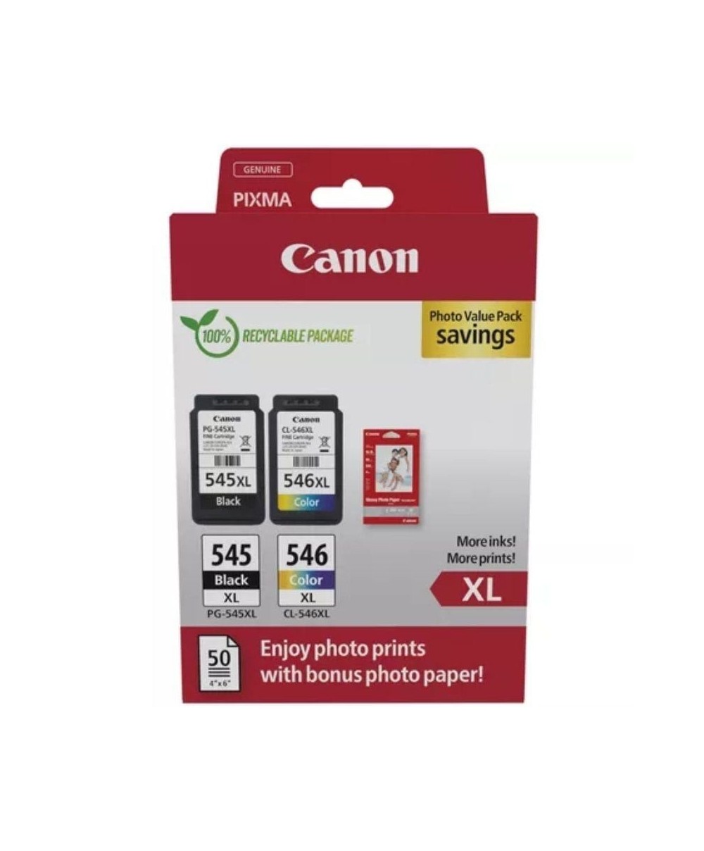 Un value pack para impresión cómoda. Este photo value pack incluye un depósito de tinta PG545XL negro de 15 ml y un depósito de tinta PG546XL en color de 13 ml así como 50 hojas de papel fotográfico con brillo de 10 x 15 cm para tu PIXMA. Imprime hasta 400 páginas de documentos A4 en blanco y negro o 300 de documentos A4 en color en el estándar ISO/IEC 24711.
