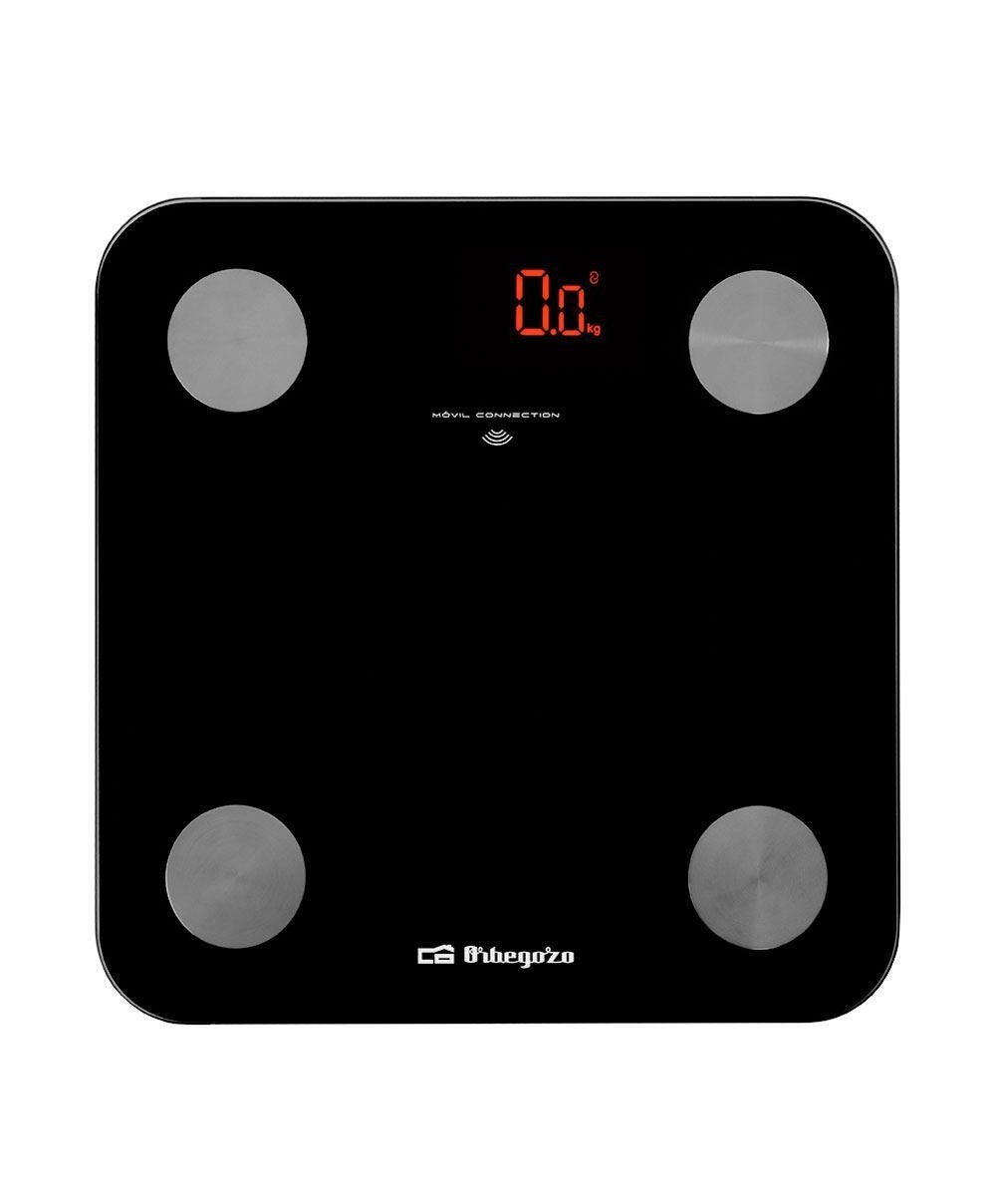 ORBEGOZO Bascula baño Bluetooth 180Kg., Pantalla oculta "shadow LED", Calcula el porcentaje de masa muscular, adiposa, osea e hidratacion, etc. Negra
