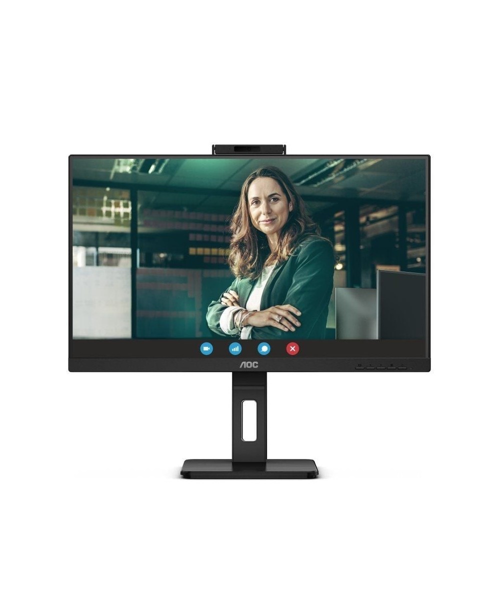 El AOC 24P3QW es un monitor profesional de 23,8 pulgadas con panel IPS Full HD y frecuencia de actualización de hasta 100 Hz. Incorpora webcam de 2 MP compatible con Windows Hello y micrófono integrado, altavoces estéreo de 5 W y un hub USB 3.2. Su soporte ergonómico ofrece ajuste completo de altura, giro, pivote e inclinación, mientras que su diseño sin marco en tres lados facilita configuraciones multipantalla.