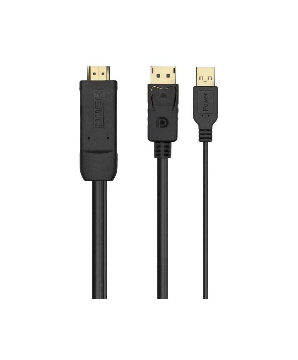 Cable conversor activo HDMI 2.0 a DISPLAYPORT 1.2 con conector HDMI macho, USB alimentación macho en un extremo y DISPLAYPORT macho en el otro.