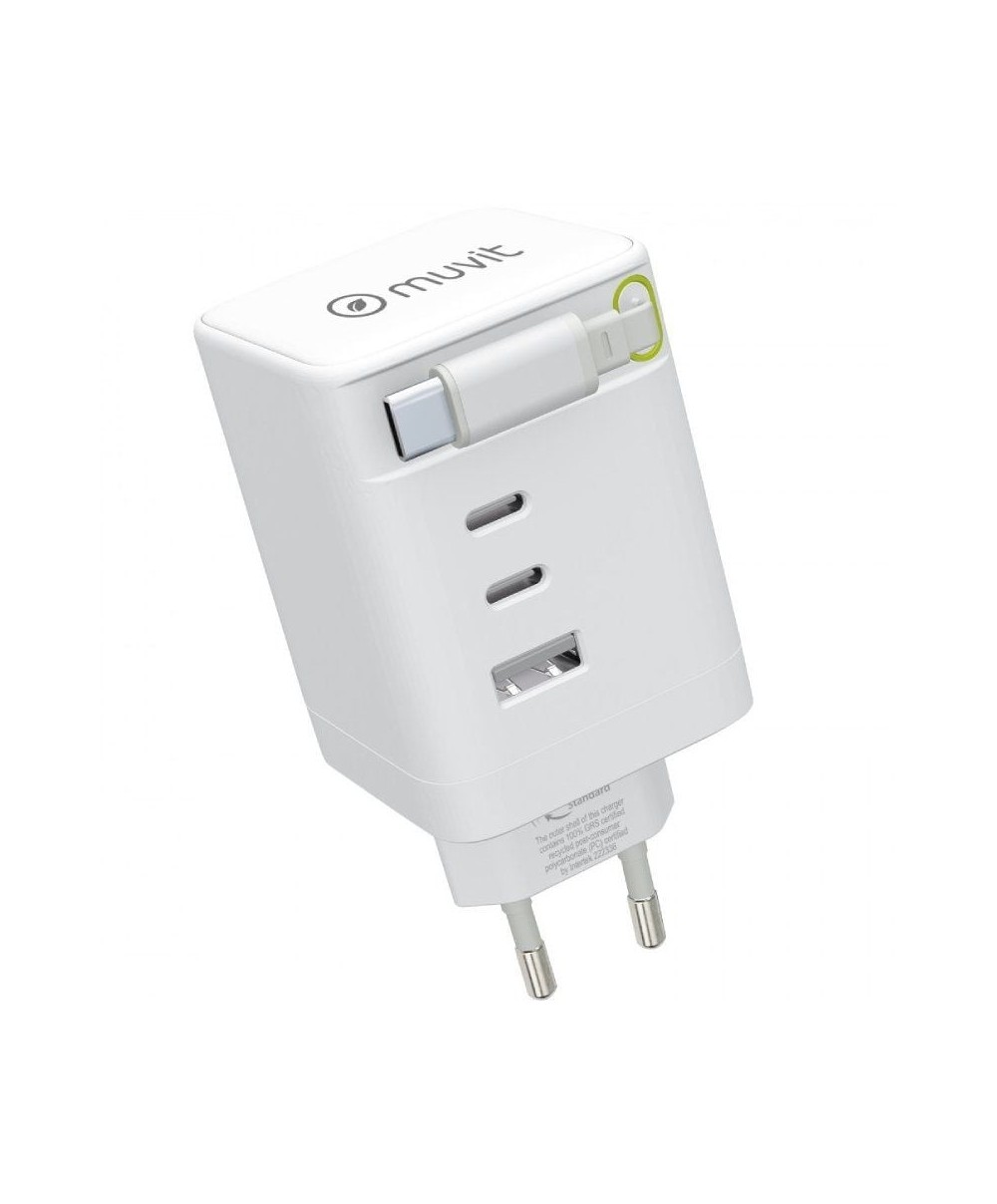 muvit for change cargador de pared Retráctil Tipo C PD 100W,2 USB-C y 1 USB blanco