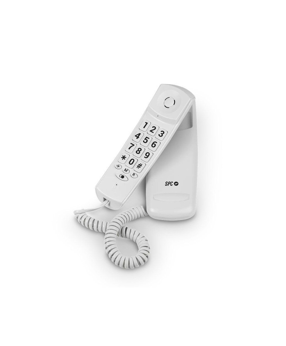 Teléfono fijo compacto, sencillo y elegante con teclas grandes, indicador luminoso de llamada entrante, 10 memorias indirectas y función rellamada.