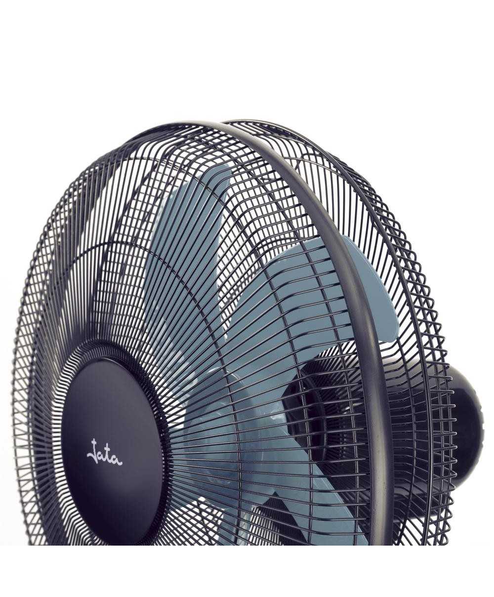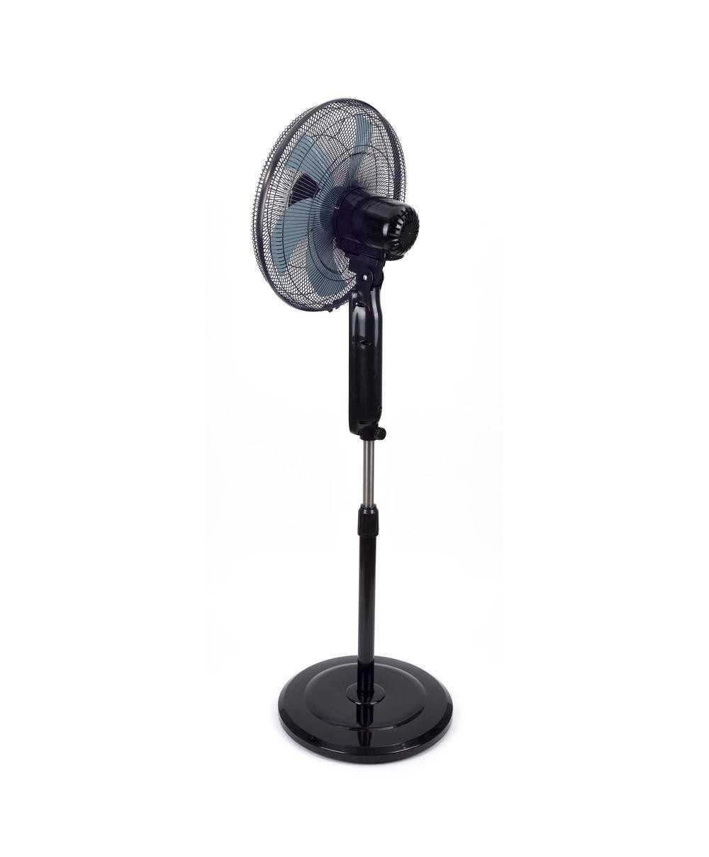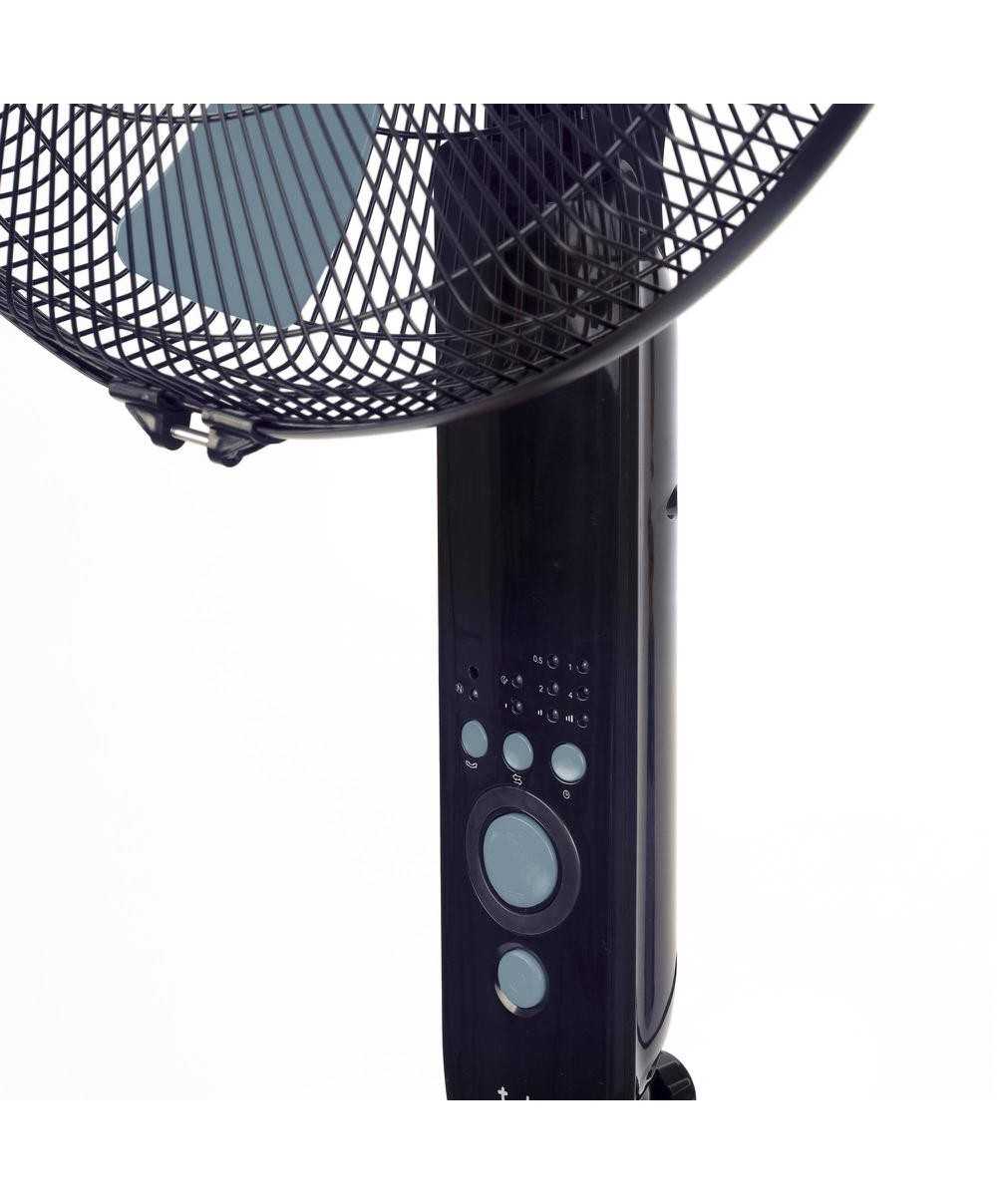Ventilador con mando a distancia. Temporizador 7 horas y 30 minutos. 3 velocidades. Función noche, intermitente. Interruptor para función oscilante. Cabezal inclinable.Altura regulable. Rejilla de metal protectora, delantera y trasera.Nivel sonoro máximo: 60 dB. Base de apoyo redonda, gran estabilidad.