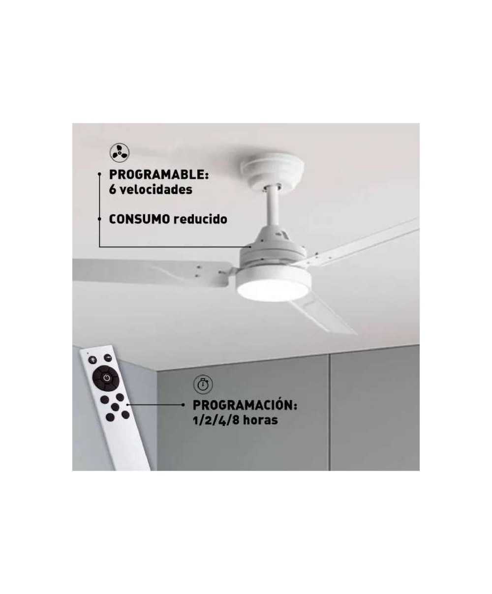 106 cm.Aspas de metal.Luz LED con tres temperaturas de color: luz fría, neutra y cálida.Mando a distancia.Función Reverse invierno/verano: refresca en verano y distribuye el calor en invierno.Eficiente motor DC de cobre. 6 velocidades.